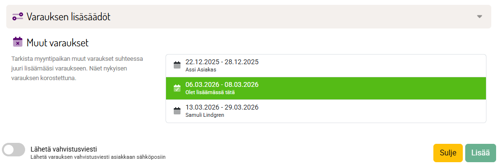 Uutta varausta tehdessä saman paikan muut varaukset näkyy nyt selkeämmin, ja näkymään haetaan vain valitun ajankohdan lähettyvillä olevat varaukset. Näet myöskin nykyisen varauksen selkeästi vahvennettuna.